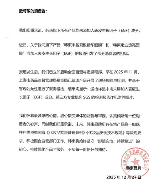 12月27日,@韓束KANS發(fā)文稱,“報(bào)道發(fā)生后,我們已立即啟動全面自查與追溯程序。早在2025年11月,上海市藥品監(jiān)督管理局稽查局已就該產(chǎn)品開展了現(xiàn)場核驗(yàn)與檢測,并基于客觀公允性進(jìn)行了雙向送檢,結(jié)果均顯示送檢樣品中均未添加人表皮生長因子(EGF)成分。”