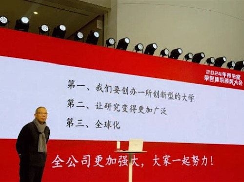 1月22日,農(nóng)夫山泉母公司養(yǎng)生堂集團(tuán)舉辦年會(huì),農(nóng)夫山泉?jiǎng)?chuàng)始人鐘睒睒出席并發(fā)表演講。會(huì)上,鐘睒睒首次透露要?jiǎng)?chuàng)辦一所創(chuàng)新型的大學(xué),并計(jì)劃未來10年捐贈(zèng)400億元。圖片來源:新華網(wǎng)