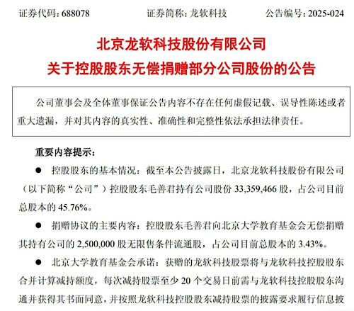 市值約7725萬元!龍軟科技控股股東向北京大學捐贈250萬股公司股份