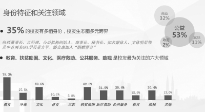 在身份特征方面,有35%的校友擁有多棲身份,校友生態(tài)圈多元跨界,包括包括董事長、總經(jīng)理、公益機構(gòu)創(chuàng)始人、理事長、秘書長、知名媒體人、文體明星等,其中有兩名GPL學員——董方軍和游忠惠加入了“捐贈誓言”。