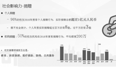 在個人捐贈方面,96%的校友2016年度有個人捐贈行為,實際捐贈總額超過1億元人民幣;而據(jù)不完全統(tǒng)計,個人年度實際捐贈超過百萬的有八位,過千萬的有三位。而在機構(gòu)捐贈方面,50%的校友機構(gòu)在2016年度有捐贈行為,平均額度為200萬元。分析顯示,校友捐贈領(lǐng)域排在前五位的是教育、扶貧助困、醫(yī)療救助、助殘、公共服務。