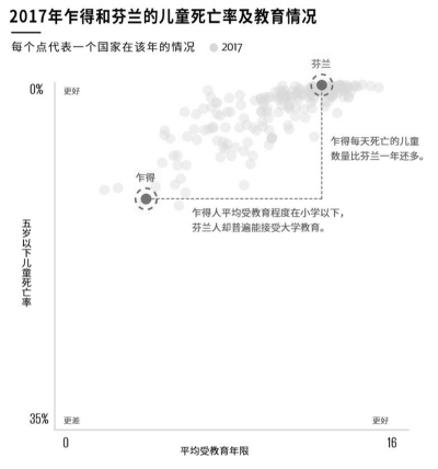 數(shù)據顯示,近年來全球各地健康和教育水平都有顯著改善,國家之間的不平等有所減少,但很多問題依舊很嚴峻。例如,報告對2017年乍得和芬蘭的兒童死亡率及教育情況進行了對比。結果顯示,乍得人平均受教育程度在小學以下,芬蘭人普遍能接受大學教育;乍得每天死亡的兒童數(shù)量比芬蘭一年的兒童死亡率還要高。