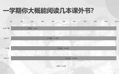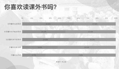 數(shù)據(jù)顯示,有3.5%的山區(qū)學(xué)生從來不看課外書;閱讀課外書在三本以下的山區(qū)學(xué)生比城市學(xué)生多10%左右;閱讀課外書五本以上的城市學(xué)生比山區(qū)學(xué)生多12%左右;非常喜歡也經(jīng)常讀課外書的城市學(xué)生比山區(qū)學(xué)生多近10%;非常喜歡,但不經(jīng)常讀課外書的山區(qū)學(xué)生和城市學(xué)生比例都高于20%。