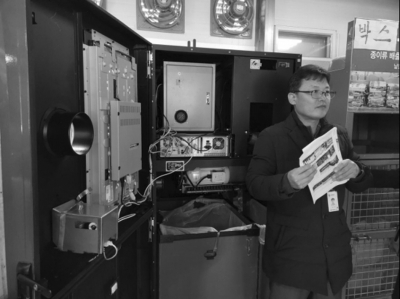 西歸浦市政府生活環(huán)境課Clean House組長梁根赫展示易拉罐、塑料瓶回收機(jī)器內(nèi)部