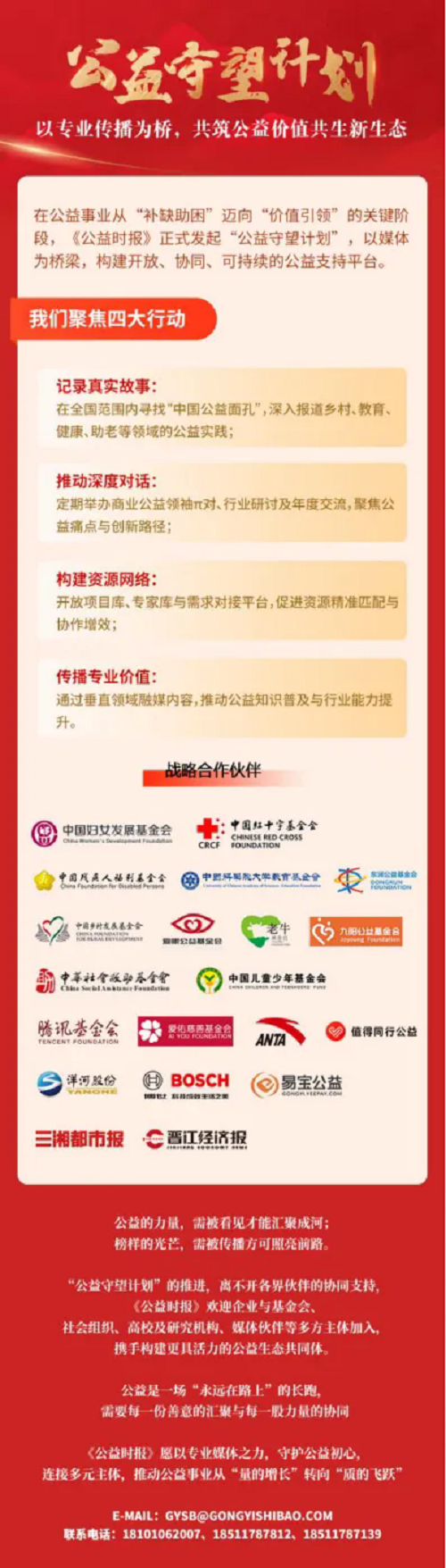 在此背景下,《公益時(shí)報(bào)》正式啟動(dòng)“公益守望·基金會(huì)高質(zhì)量發(fā)展共建計(jì)劃”。該計(jì)劃致力于為基金會(huì)提供精準(zhǔn)、專業(yè)的能力建設(shè)支持,聚焦內(nèi)部治理、資源整合、信息公開、品牌塑造等關(guān)鍵環(huán)節(jié),陪伴基金會(huì)一起成長,全方位提升綜合能力。