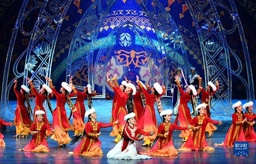 在新疆木卡姆藝術(shù)團(tuán)劇場,演員在表演《木卡姆印象》(2017年8月3日攝)。新華社記者 王菲 攝