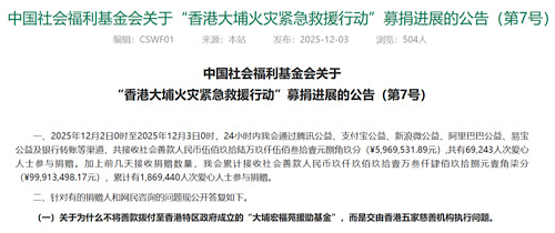 3日,中國(guó)社會(huì)福利基金會(huì)官網(wǎng)發(fā)布了關(guān)于“香港大埔火災(zāi)緊急救援行動(dòng)”募捐進(jìn)展的公告(第7號(hào))。根據(jù)公告,12月2日0時(shí)至3日0時(shí),24小時(shí)內(nèi)基金會(huì)通過騰訊公益、支付寶公益、新浪微公益、阿里巴巴公益、易寶公益及銀行轉(zhuǎn)賬等渠道,共接收社會(huì)善款5969531.89元,共有69243人次愛心人士參與捐贈(zèng)。加上前幾天接收的捐贈(zèng),累計(jì)接收社會(huì)善款99913498.17元,累計(jì)有1869440人次愛心人士參與捐贈(zèng)。