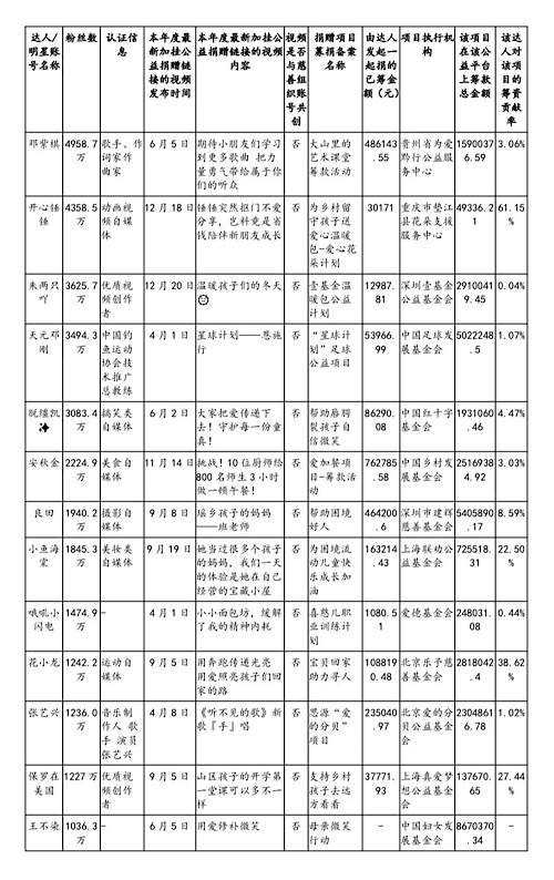 實際上,短視頻平臺上頭部達人助力公益項目籌資的情況不在少數(shù),公益時報可持續(xù)發(fā)展研究院對本年度發(fā)生的、熱度較高的抖音平臺千萬以上粉絲達人或明星賬號助力公益籌款合作的數(shù)據(jù)進行了不完全統(tǒng)計。