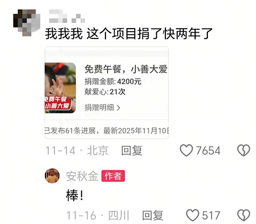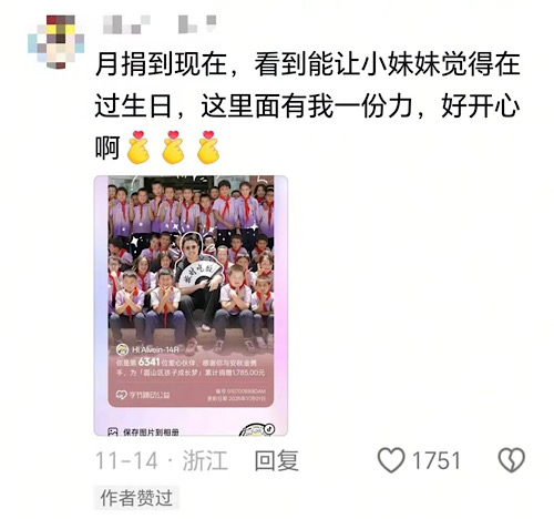 在安秋金的評論區(qū)里,一位粉絲曬出一張分享圖:“你是第6341位愛心伙伴,感謝你與安秋金攜手,為‘圓山區(qū)孩子成長夢’累計捐贈1785元。”他評論道,月捐到現(xiàn)在,看到能讓小妹妹覺得在這里過生日很開心,這里面有我一份力。