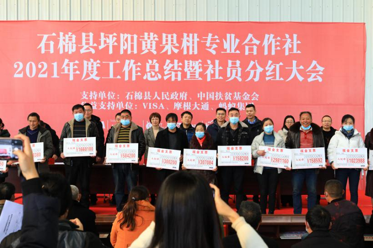 “2021年,石棉縣坪陽(yáng)黃果柑專業(yè)合作社通過(guò)開(kāi)展多項(xiàng)經(jīng)營(yíng)業(yè)務(wù)累計(jì)獲得收入903499元,支出453345元,利潤(rùn)450153元,合作社324戶認(rèn)證農(nóng)戶戶均可分得股金分紅1385元”。石棉縣坪陽(yáng)黃果柑專業(yè)合作社理事長(zhǎng)王志偉在大會(huì)中自豪地說(shuō)到:“這已經(jīng)是我們合作社連續(xù)六年分紅了”!