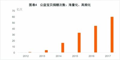 2017年公益寶貝的捐贈(zèng)次數(shù)達(dá)59.8億次,這一數(shù)字是2012年的72倍之多。從消費(fèi)者角度來(lái)看也是如此,2017年有3.5億買家支持了商家的公益行動(dòng),人均購(gòu)買公益相關(guān)的商品17次。