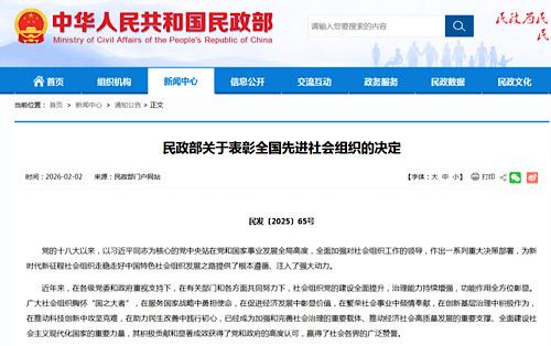 2月2日,民政部官網(wǎng)發(fā)布關(guān)于表彰全國先進(jìn)社會組織的決定。