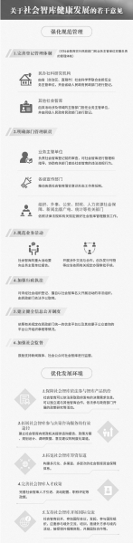 在鼓勵(lì)社會(huì)智庫發(fā)展的同時(shí),《意見》要求從強(qiáng)化自身建設(shè)和強(qiáng)化規(guī)范管理兩個(gè)方面保證社會(huì)智庫的良性運(yùn)行。