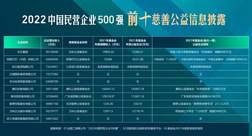 《公益時(shí)報(bào)》記者通過檢索10家企業(yè)官網(wǎng)及中國(guó)社會(huì)組織政務(wù)服務(wù)平臺(tái)發(fā)現(xiàn),“2022中國(guó)民營(yíng)企業(yè)500強(qiáng)”前十名有七家設(shè)有企業(yè)基金會(huì),三家入選首批互聯(lián)網(wǎng)公開募捐信息平臺(tái)。具體包括,京東集團(tuán)設(shè)立的京東公益基金會(huì)、阿里巴巴集團(tuán)設(shè)立的阿里巴巴公益基金會(huì)、恒力集團(tuán)設(shè)立的江蘇恒力慈善基金會(huì)、騰訊集團(tuán)設(shè)立的騰訊公益慈善基金會(huì)、碧桂園設(shè)立的廣東省國(guó)強(qiáng)公益基金會(huì)、聯(lián)想控股設(shè)立的北京聯(lián)想公益基金會(huì)以及萬(wàn)科設(shè)立的萬(wàn)科公益基金會(huì)。