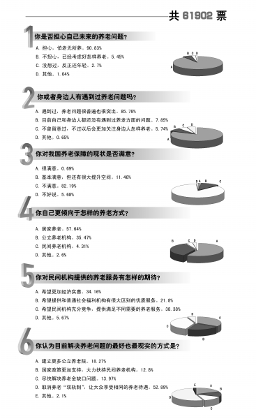 ■ 本報記者 張雪弢 有資料顯示,截至2011年底,全國60歲及60歲以上的老年人口接近1.85億人,占到總人口的13.7%。而我國人口老齡化程度還將進一步加深。到2030年,中國65歲以上人口占比將超過日本,成為全球人口老齡化程度最高的國家。 看到這樣的數(shù)據(jù),你是否有提前規(guī)劃老年生活的打算? 圍繞著養(yǎng)老問題的話題一再地被熱議:延遲退休制度設想到底實行不實行,目前尚無定論。但估計對中國社?;馉顩r略有了解的人,都難掩擔憂——如現(xiàn)狀不改變,養(yǎng)老基金虧空難填,自己數(shù)十年后的老年生活可能保障乏力,生活質量會受到非常直接的影響。 養(yǎng)老難題誰來解?你是否擔心自己未來的養(yǎng)老問題呢?對于可能會成為養(yǎng)老服務重要力量的民間機構你有怎樣的期待?《公益時報》與搜狐公益聯(lián)手推出的“益調(diào)查”結果顯示,90.83%的網(wǎng)友擔心自己老無所養(yǎng),超過八成的網(wǎng)友自己或身邊人都遇到過養(yǎng)老問題。 調(diào)查結果: 本次調(diào)查從9月26日10時至10月8日10時,共有61902位網(wǎng)友參與調(diào)查。調(diào)查結果顯示,超過九成的網(wǎng)友表示擔心自己未來的養(yǎng)老問題,怕老無所養(yǎng)。5.45%的網(wǎng)友則表示并不擔心,已經(jīng)考慮好未來怎樣養(yǎng)老。少部分網(wǎng)友表示沒想過未來怎樣養(yǎng)老的問題,反正自己還年輕。網(wǎng)友“軒川寺苑”留言說:兩個孩子,要照顧四個老人,這還是孝順的,如果沒人管你,那可就慘了,能不擔心嗎。 在“你或者身邊人有遇到過養(yǎng)老問題嗎?”的調(diào)查中,85.78%的網(wǎng)友表示遇到過,養(yǎng)老問題很普遍也很突出。7.85%的網(wǎng)友則表示,目前自己和身邊人都還沒有遇到過養(yǎng)老方面的問題。5.74%的參與調(diào)查者表示,不曾留意過,不過以后會更加關注身邊人怎樣養(yǎng)老。 大家對我國養(yǎng)老保障的現(xiàn)狀是否滿意呢?82.19%的網(wǎng)友并不滿意。11.46%的網(wǎng)友表示基本滿意,但還有很大提升空間。僅有0.69%的網(wǎng)友表示很滿意,還有部分網(wǎng)友認為不好說。網(wǎng)友“dolphinyu”留言說:希望我們的國家在養(yǎng)老的方法上更多地借鑒西方社會福利保障做得好的國家的方法。 養(yǎng)老方式有多種,而大家更傾向于怎樣的養(yǎng)老方式呢?在參與調(diào)查的網(wǎng)友中,近六成網(wǎng)友都選擇了居家養(yǎng)老,35.47%的網(wǎng)友選擇了公立養(yǎng)老機構。值得注意和思考的數(shù)據(jù)是,僅有4.31%的網(wǎng)友選擇了民間養(yǎng)老機構。 盡管選擇民間養(yǎng)老機構的網(wǎng)友并不多,但大家還是對民間機構提供的養(yǎng)老服務有所期待的。 在“你對民間機構提供的養(yǎng)老服務有怎樣的期待?”的調(diào)查中,38.38%的網(wǎng)友希望民間機構充分競爭,提供滿足不同需要的養(yǎng)老服務。34.16%的網(wǎng)友則希望更加經(jīng)濟實惠。還有21.8%的網(wǎng)友希望提供和普通社會福利機構有很大區(qū)別的優(yōu)質服務。 那么,在網(wǎng)友心中目前解決養(yǎng)老問題的最好也最現(xiàn)實的方式是什么呢?52.89%的網(wǎng)友認為應該取消養(yǎng)老“雙軌制”,讓大眾享受相同的養(yǎng)老待遇。18.27%的網(wǎng)友建議建立更多公立養(yǎng)老院。13.97%的網(wǎng)友希望盡快解決養(yǎng)老金缺口問題。還有部分網(wǎng)友期待國家政策更加支持,大力扶持民間養(yǎng)老機構。網(wǎng)友“修身養(yǎng)心205970”留言說:退休雙軌制不取消,養(yǎng)老會成為社會問題;差距太大,貧富不均,老年人沒有幸福感,年輕人沒有安全感。 |