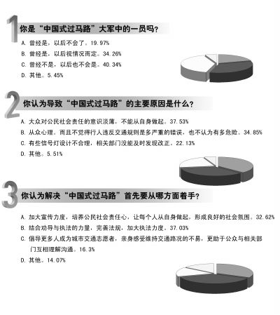 ■ 本報(bào)記者 張雪弢 近日,網(wǎng)友“這個(gè)絕對(duì)有意思”發(fā)布了這樣一則微博:“中國式過馬路,就是湊夠一撮人就可以走了,和紅綠燈無關(guān)?!蔽⒉┡鋱D中,雖然從照片上看不到交通信號(hào)燈,但有好幾位行人并沒有走在斑馬線上,而是走在旁邊的機(jī)動(dòng)車變道路標(biāo)上,其中有推著嬰兒車的老人,也有電動(dòng)車、賣水果的三輪車。 這條微博引起了不少網(wǎng)友的共鳴,一天內(nèi)被近10萬網(wǎng)友轉(zhuǎn)發(fā)。經(jīng)央視等媒體報(bào)道后,再次引爆網(wǎng)絡(luò)。 有評(píng)論說:“只要一個(gè)人敢?guī)ь^闖紅燈,剩下的人就跟著一起了”的現(xiàn)狀,透露出群眾對(duì)規(guī)則缺少敬畏心理,“法不責(zé)眾”的思想也在人們心里根深蒂固,“群膽效應(yīng)”的后果就是集體違章。網(wǎng)友建議,要治好“中國式過馬路”的“暗傷”,就得下“猛藥”,結(jié)合城市實(shí)際,制定相適應(yīng)的獎(jiǎng)懲制度,做到有法可依,運(yùn)用執(zhí)法的力量,加大處罰力度。 然而,行人不論“紅綠燈”搶著過馬路僅僅是行人的素質(zhì)問題?加大懲罰就可以解決問題?《公益時(shí)報(bào)》與搜狐公益聯(lián)手推出的“益調(diào)查”結(jié)果顯示,40.34%的網(wǎng)友表示不曾是“中國式過馬路”大軍中的一員,并且以后也不會(huì)是;37.53%的網(wǎng)友認(rèn)為導(dǎo)致“中國式過馬路”的主要原因是:大眾對(duì)公民社會(huì)責(zé)任的意識(shí)淡薄,不能從自身做起。 調(diào)查結(jié)果: 本次調(diào)查從10月19日14時(shí)至10月21日22時(shí),共有6191位網(wǎng)友參與調(diào)查。 “益調(diào)查”結(jié)果顯示,40.34%網(wǎng)友明確表示,以前不是“中國式過馬路”大軍中的一員,以后也不會(huì)是;34.26%的網(wǎng)友則表示曾經(jīng)是,以后是不是也要視情況而定;19.97%的網(wǎng)友表示,曾經(jīng)是“中國式過馬路”大軍中的一員,但以后不會(huì)了。 在大家心中,導(dǎo)致“中國式過馬路”的主要原因是什么呢? 參與調(diào)查的網(wǎng)友中,37.53%的網(wǎng)友認(rèn)為“大眾對(duì)公民社會(huì)責(zé)任的意識(shí)淡薄,不能從自身做起”導(dǎo)致了“中國式過馬路”的產(chǎn)生;34.85%的網(wǎng)友則認(rèn)為是從眾心理,并且這樣過馬路的人不覺得行人違反交通規(guī)則是多嚴(yán)重的錯(cuò)誤,也不認(rèn)為有多危險(xiǎn);同時(shí),也有22.13%的網(wǎng)友認(rèn)為有些信號(hào)燈設(shè)計(jì)不合理,相關(guān)部門沒能及時(shí)發(fā)現(xiàn)改正。 那么,解決“中國式過馬路”首先要從哪方面著手? 37.03%的網(wǎng)友認(rèn)為,要結(jié)合勸導(dǎo)與執(zhí)法的力量,完善法規(guī),加大執(zhí)法力度;32.62%的網(wǎng)友則表示,應(yīng)該加大宣傳力度,培養(yǎng)公民社會(huì)責(zé)任心,讓每個(gè)人從自身做起,形成良好的社會(huì)氛圍;也有部分網(wǎng)友選擇了“倡導(dǎo)更多人成為城市交通志愿者,親身感受維持交通路況的不易,更助于公眾與相關(guān)部門互相理解溝通?!?/p> |