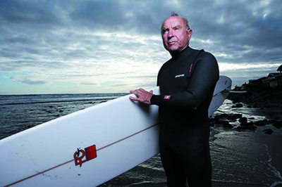 古稀之年的修納德依然堅(jiān)持沖浪,圖為修納德手持自家生產(chǎn)的環(huán)保沖浪板