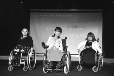 (上)“自立生活”培訓結業(yè)典禮上,學員們自編自導自演著各種精彩節(jié)目。(下)學員們在志愿者的陪同下學習無障礙出行。