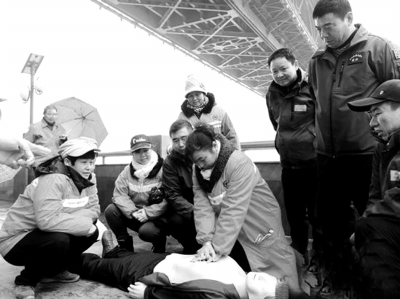 12月20日,在武漢長江大橋清潔隊的“救人姐”涂曉珍的邀請下,長江救援隊隊員來到了長江大橋橋堡下,與30余名環(huán)衛(wèi)工人們進行了會面。兩支隊伍達成一致:今后互留電話,及時溝通,橋上橋下共同救援。長江隊隊員趙漢清以現(xiàn)場模擬救人的方式,給幾名環(huán)衛(wèi)工培訓(xùn)了心肺復(fù)蘇。