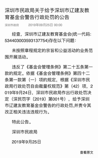 ■ 本報(bào)記者 文梅 9月25日,深圳市民政局發(fā)布《關(guān)于給予深圳市遼建友教育基金會(huì)警告行政處罰的公告》?!豆妗访鞔_,深圳市遼建友教育基金會(huì)存在以下問(wèn)題: 未按照章程規(guī)定的宗旨和公益活動(dòng)的業(yè)務(wù)范圍開展活動(dòng)。 違反了《基金會(huì)管理?xiàng)l例》第二十五條第一款的規(guī)定。依據(jù)《基金會(huì)管理?xiàng)l例》第四十二條第一款第(一)項(xiàng)的規(guī)定,根據(jù)《深圳市民政局行政處罰自由裁量權(quán)規(guī)范》第(42)項(xiàng),2019年9月24日,深圳市民政局作出行政處罰決定(深民罰字〔2019〕第001號(hào)),給予深圳市遼建友教育基金會(huì)警告的行政處罰,并責(zé)令其改正相關(guān)違法違規(guī)行為。 此前,關(guān)于深圳市遼建友教育基金會(huì)“未按照章程規(guī)定的宗旨和公益活動(dòng)的業(yè)務(wù)范圍開展活動(dòng)”的問(wèn)題,《公益時(shí)報(bào)》于6月份進(jìn)行了報(bào)道。 深圳市遼建友教育基金會(huì)(以下簡(jiǎn)稱‘遼建友基金會(huì)’)設(shè)立“財(cái)智投資基金”,以“公益捐存”的方式,承諾預(yù)期回報(bào),面向沈陽(yáng)建筑大學(xué)校友群體公開募捐。 該報(bào)道源自微信網(wǎng)友“簡(jiǎn)出橋”先生的反饋,稱其發(fā)現(xiàn)深圳市遼建友教育基金會(huì)在微信公眾號(hào)對(duì)其運(yùn)作的“財(cái)智投資基金”公益捐存項(xiàng)目描述如下——基金會(huì)按照章程使用籌款項(xiàng)及其增值收益,并向捐贈(zèng)人支付按中國(guó)人民銀行同期人民幣存款基準(zhǔn)利率計(jì)算的存款利息,在投資周期結(jié)束后,捐贈(zèng)人可以按照自己的意愿全額收回捐贈(zèng)存款(捐存)的本金和存款利息。簡(jiǎn)出橋認(rèn)為遼建友基金會(huì)的“公益捐存”項(xiàng)目涉嫌違法,遂向深圳市民政局和《公益時(shí)報(bào)》進(jìn)行了舉報(bào)。 經(jīng)過(guò)《公益時(shí)報(bào)》記者多方了解調(diào)查,簡(jiǎn)出橋反映的情況屬實(shí),且遼建友基金會(huì)亦不愿主動(dòng)就此事予以解釋和說(shuō)明。 該報(bào)道刊發(fā)后引起業(yè)界廣泛關(guān)注?!豆鏁r(shí)報(bào)》獲悉,報(bào)道刊發(fā)后,民政部執(zhí)法處已很快將此事交由深圳民政主管部門調(diào)查處理。 在此后的跟蹤報(bào)道采訪中,深圳市民政局執(zhí)法監(jiān)督處工作人員向記者表示,深圳民政局執(zhí)法部門會(huì)嚴(yán)格按照相關(guān)執(zhí)法流程推進(jìn)此事,無(wú)論調(diào)查結(jié)果如何,一定會(huì)及時(shí)通過(guò)公開渠道予以公示。 三個(gè)月后,深圳市民政局通過(guò)其官網(wǎng)“深圳民政在線”就此事發(fā)布公告,稱“給予深圳市遼建友教育基金會(huì)警告行政處罰”,深圳市政府官方網(wǎng)站亦對(duì)此公告進(jìn)行了轉(zhuǎn)載。 |