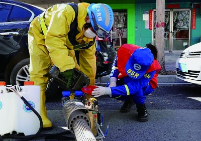 河南鄭州紅十字藍(lán)天應(yīng)急救援隊(duì)“夫妻檔”李劍和黃俊。圖為2月16日,黃俊(右)在消殺作業(yè)前幫李劍給消毒設(shè)備加油