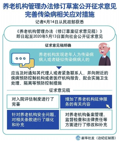 4月14日,民政部對(duì)外公布了《養(yǎng)老機(jī)構(gòu)管理辦法(修訂草案征求意見(jiàn)稿)》(以下簡(jiǎn)稱(chēng)《征求意見(jiàn)稿》),并向社會(huì)各界征求意見(jiàn)。意見(jiàn)反饋截止時(shí)間為2020年5月13日。