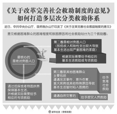 ■ 本報記者 王勇 近日,中共中央辦公廳、國務(wù)院辦公廳印發(fā)了《關(guān)于改革完善社會救助制度的意見》(以下簡稱《意見》)。民政部有關(guān)負責(zé)人就貫徹落實《意見》有關(guān)問題回答了記者的提問。民政部將會同有關(guān)部門采取有效措施,積極推動《意見》貫徹落實。 社會救助發(fā)展不平衡不充分 社會救助事關(guān)困難群眾基本生活和衣食冷暖,關(guān)系民生、連著民心,是社會建設(shè)的兜底性、基礎(chǔ)性工作。黨的十八大以來,以習(xí)近平同志為核心的黨中央對社會救助工作作出一系列重大部署,2014年國務(wù)院頒布《社會救助暫行辦法》,確立了以最低生活保障、特困人員供養(yǎng)、受災(zāi)人員救助、醫(yī)療救助、教育救助、住房救助、就業(yè)救助、臨時救助為主體,社會力量參與為補充的“8+1”社會救助制度框架。各地區(qū)、各有關(guān)部門相應(yīng)出臺配套政策,不斷完善制度體系、健全體制機制,使社會救助在保障基本民生、打贏脫貧攻堅戰(zhàn)、全面建成小康社會等方面發(fā)揮了重要作用。每年有近5000萬困難群眾得到基本生活救助,實施臨時救助1000多萬人次。近5年來,我國城市和農(nóng)村低保標準年均分別增長8.7%和14%。各專項救助也取得明顯成效。 但是,與新時代困難群眾對美好生活的向往相比,社會救助發(fā)展不平衡不充分的問題仍然較為突出。比如,一些救助政策和保障措施只覆蓋特困人員、低保對象;制度之間協(xié)調(diào)聯(lián)動不夠,救助資源分散,救助信息不能互通共享,兜底保障安全網(wǎng)不夠嚴密;救助方式和供給主體單一,難以滿足困難群眾多樣化救助需求;一些地方投入不足,基層經(jīng)辦服務(wù)能力薄弱等。這些問題影響了困難群眾的獲得感、幸福感、安全感,是當(dāng)前基本民生兜底保障工作的短板和弱項。黨的十九大提出統(tǒng)籌城鄉(xiāng)社會救助體系,完善最低生活保障制度;黨的十九屆四中全會要求統(tǒng)籌完善社會救助制度,注重加強普惠性、基礎(chǔ)性、兜底性民生建設(shè),保障群眾基本生活,這為新時代改革完善社會救助制度指明了方向?!兑庖姟氛窃谶@樣的背景下制定出臺的。 保基本、兜底線、救急難、可持續(xù) 《意見》以習(xí)近平新時代中國特色社會主義思想為指導(dǎo),全面貫徹黨的十九大和十九屆二中、三中、四中全會精神,堅持問題導(dǎo)向、目標導(dǎo)向、效果導(dǎo)向相結(jié)合,按照保基本、兜底線、救急難、可持續(xù)的總體思路,提出了兜底保障基本民生的綜合改革舉措,是引領(lǐng)新時代社會救助事業(yè)高質(zhì)量發(fā)展的重要指導(dǎo)性文件,確定的目標原則和改革任務(wù)充分考慮了未來一個時期我國社會救助制度的發(fā)展趨勢及時代要求。 一是有效銜接扶貧開發(fā)政策,確保2020年打贏脫貧攻堅戰(zhàn),為完全喪失勞動能力和部分喪失勞動能力且依靠產(chǎn)業(yè)就業(yè)幫扶無法脫貧的困難群眾提供兜底保障,鞏固脫貧攻堅成果;二是堅持問題導(dǎo)向,在兜底線、織密網(wǎng)、建機制上完善政策制度,形成基本民生保障長效機制;三是根據(jù)新時代我國社會主要矛盾已經(jīng)轉(zhuǎn)化的實際,聚焦特殊群體,回應(yīng)群眾關(guān)切,增強社會救助的精準識別和反應(yīng)能力,使有需要的困難群眾都能得到及時救助;四是適應(yīng)我國經(jīng)濟發(fā)展新常態(tài),科學(xué)確定救助標準和水平。 按照上述思路,《意見》以統(tǒng)籌救助資源、增強兜底功能、提升服務(wù)能力為重點,提出了一攬子改革措施。主要內(nèi)容分為三個部分。第一部分是總體要求,提出新時代我國社會救助發(fā)展的指導(dǎo)思想、基本原則和總體目標。第二部分是改革完善社會救助制度的重點任務(wù),分別從建立分層分類的社會救助體系、夯實基本生活救助、健全專項社會救助、完善急難社會救助、促進社會力量參與、深化“放管服”改革等方面提出一系列具體改革措施。第三部分從加強組織領(lǐng)導(dǎo)、落實部門責(zé)任、提高基層服務(wù)能力、加強監(jiān)督檢查等方面明確落實《意見》的保障措施。 七方面創(chuàng)新 《意見》以統(tǒng)籌救助資源、增強兜底功能、提升服務(wù)能力為重點,在政策設(shè)計和制度安排上有不少創(chuàng)新舉措,最突出的有以下幾個方面: 一是構(gòu)建綜合救助格局?!兑庖姟芬蠹涌鞓?gòu)建政府主導(dǎo)、社會參與、制度健全、政策銜接、兜底有力的綜合救助格局。以基本生活救助、專項社會救助、急難社會救助為主體,社會力量參與為補充,建立健全分層分類的救助制度體系,實現(xiàn)精準救助、高效救助、溫暖救助、智慧救助。 二是打造多層次分類救助體系?!兑庖姟犯鶕?jù)困難群眾的困難程度和致困原因?qū)⑸鐣戎鷦澐譃槿齻€救助圈:最核心的是絕對貧困人口,通過低?;蛘咛乩ЧB(yǎng)保障基本生活,并根據(jù)實際需要給予相應(yīng)的醫(yī)療、住房、教育、就業(yè)等專項救助;第二圈是相對貧困人口(即低收入和剛性支出較大導(dǎo)致基本生活出現(xiàn)嚴重困難的家庭),根據(jù)實際需要給予相應(yīng)的基本生活救助或醫(yī)療、住房、教育、就業(yè)等專項救助;第三圈是其他困難群眾,主要包括遭遇突發(fā)事件、意外傷害、重大疾病或其他特