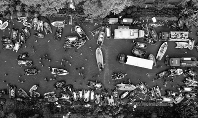 7月25日,滿載石料的重型卡車被推入衛(wèi)河鶴壁市??h新鎮(zhèn)鎮(zhèn)彭村段的決口處(無人機照片)(新華社記者 張浩然/攝)