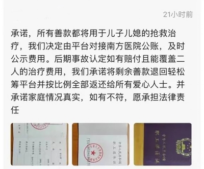 兩家人、同一車出行,不料遭遇汽車起火意外事故。日前,廣東佛山兩條來自輕松籌的籌款鏈接很快吸引數(shù)十萬人捐款,兩個遭遇不測的家庭600萬元的籌資目標迅速完成。 在大家接力“慷慨解囊”的同時,一些質(zhì)疑的聲音也開始出現(xiàn)。對此,記者采訪當(dāng)事人家屬及平臺,對這一事件進行調(diào)查。 兩家人同車出行 遭遇意外事故被燒傷 8月9日晚,一條名為“順德一家三口不幸意外重度燒傷生命垂危,懇求您救救我孫女一家”的第三方籌款鏈接,刷爆了廣東省佛山市順德區(qū)的市民朋友圈。 “看著可愛的孫女躺在病床上奄奄一息的樣子,我的心就像被刀切碎了一樣?!卑l(fā)起求助的,是其中一位女性傷者的父親。 這位父親稱,今年8月8日中午1時,女兒一家在乘車中突然意外遭遇火災(zāi)造成特重度燒傷,隨后送到了醫(yī)院搶救。 求助鏈接放上了其女兒、女兒丈夫及孫女的燒傷治療照。病床上的傷者全身包裹著繃帶。鏈接上,發(fā)起求助者還公布了一家人的傷情,并曬出了醫(yī)院相關(guān)診斷書。其女兒何某全身多處特重度燒傷90%,孫女全身多處特重度燒傷85%,其女婿梁某則是頭部、四肢重度燒傷40%,傷情嚴重。 值得關(guān)注的是,在鏈接發(fā)出后當(dāng)晚,數(shù)小時400萬元款項就籌集完畢。 同車遭遇意外燒傷的還有另一家人。第二天(8月10日)傍晚,這一家人的籌資救助的鏈接也開始出現(xiàn)在市民的朋友圈上。據(jù)悉,其籌資目標為200萬元。 發(fā)起救助的是傷者之一的父親。他稱,其兒子一家與另一家是“開著借用的車”出行,隨后突然出現(xiàn)意外(交警和消防正在調(diào)查起火事故原因)?!皟H僅幾秒鐘時間車廂里滿是火焰,兒子到第三排抱著我的小孫女拖著兒媳下車,孫女在爸爸的保護下面部、手臂和腿部也均有輕度燒傷,但夫妻兩人卻被大火包圍造成重度燒傷,所乘車輛也被燒成了空架子?!?/p> 鏈接上,求助者也放出了一家的救治照片,附上了診斷證明。據(jù)悉,這一家男性傷者徐某全身各處重度燒傷50%,其妻子盧某全身重度燒傷30%。而經(jīng)過一晚上,200萬元善款也籌資完成。 關(guān)于家庭財產(chǎn) “我說得實事求是” 接連兩天,佛山全社會為兩個家庭共籌資超過600萬元。記者了解到,在大家接力“慷慨解囊”的同時,關(guān)于傷者家庭真實情況等一些質(zhì)疑的聲音開始出現(xiàn)。 針對質(zhì)疑,10日,輕松籌平臺上更新了一份關(guān)于傷者家庭財產(chǎn)情況的證明。記者看到,在證明文末的一行“經(jīng)核實,該家庭為我社區(qū)非低保家庭,非低保臨界家庭”手寫字樣上,蓋上了傷者梁某所在居委會印章。 證明還提及了傷者梁某夫妻在北滘坤洲開設(shè)一間加工作坊,有一幢自建房,有一臺小轎車等。 對此,記者也第一時間就該份證明向蓋章單位進行核實。據(jù)其所在的碧江村委會相關(guān)負責(zé)人介紹,該證明確實是經(jīng)居委會之手。 8月11日,記者找到了遭遇事故家庭之一傷者梁某的親哥哥。他回應(yīng)稱,對于網(wǎng)上提及的一些質(zhì)疑聲音,自己實話實說,“光明正大”。 “我弟弟的情況全都是真實的?!绷耗车母绺邕€表示,關(guān)于一些質(zhì)疑的聲音,自己暫時無暇顧及。當(dāng)務(wù)之急要籌資救人,讓家人脫離危險?!俺霈F(xiàn)這樣的變故,誰都不愿意接受。” 關(guān)于治療費用 “做好了賣房的準備” 梁某的哥哥透露,當(dāng)前弟弟一家暫未脫離生命危險。近段時間來,除安撫、陪伴傷者家庭,他還奔走在保險公司、社保部門等,爭取更多權(quán)益。 因為不在急救第一現(xiàn)場,梁某哥哥表示對上眾籌平臺一事了解不多,但也就緣何籌資400萬元進行了回應(yīng)。 他稱,據(jù)收治其弟媳的廣州市紅十字會醫(yī)院給出的治療方案,全部治療費用“保底”也要200萬元?!暗艿芎椭杜谀戏结t(yī)院,現(xiàn)在還沒脫離危險期,醫(yī)院表示還無法給出具體的治療費用。但是我坦誠說,400萬元肯定是不夠的。” “我們已經(jīng)做好準備了,將全部身家都拿出來,用來救人。”梁某哥哥回應(yīng)記者,一家人已經(jīng)做好了“最壞打算”?!耙劝盐业艿姆孔淤u了,如果還不夠的話,就把我爸的一個房子拿出來賣了,現(xiàn)在已經(jīng)做好這樣的準備了?!彼€表示,目前一家人也在等待事故原因的查明。 該籌款鏈接也發(fā)出了新的籌款動態(tài)。其中上傳了三名患者費用診斷證明,表示前期合計320萬元費用缺口。 平臺回應(yīng) 已觸發(fā)“風(fēng)控機制” 在眾籌過程中,不少網(wǎng)友也對平臺提出質(zhì)疑,包括材料審核、籌款修改等。 8月10日,輕松籌平臺經(jīng)過內(nèi)部調(diào)查,并通過采訪函回復(fù)記者,此次順德燒傷家庭的籌款事宜,是輕松籌籌款顧問在醫(yī)院遇到了發(fā)起人,在發(fā)起人表達對籌款有需求后,其對項目發(fā)起的步驟及所需材料進行了輔導(dǎo)。 那么,在該起求助信息中,平臺對于求助人的傷情,以及家庭背景做了哪些調(diào)查工作? 平臺表示,根據(jù)《自律公約2.0》的規(guī)定,平臺要求發(fā)起人按平臺規(guī)定,提交發(fā)起人及求助人身份信息、醫(yī)療機構(gòu)開具的醫(yī)療證明等真實材料,并對材料進行形式審核。平臺嚴格按照《自律公約》執(zhí)行。另外,平臺積極與求助人進行溝通,提供必要的蓋章證明材料。 平臺表示,這一求助信息不存在“文