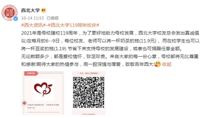 近日,西北大學(xué)官方微博發(fā)出的一則募捐倡議引發(fā)網(wǎng)友熱議。 今年,西北大學(xué)迎來建校119周年。該校校友總會(huì)號(hào)召校友、老師及學(xué)生,每月捐出一杯奶茶或一杯豆?jié){的錢,支持母校發(fā)展。 倡議發(fā)出后,引來網(wǎng)友調(diào)侃西北大學(xué)是“中國最窮211”。 10月18日,西北大學(xué)工作人員回應(yīng)稱,校友捐贈(zèng)是大學(xué)經(jīng)費(fèi)的來源之一,很多大學(xué)都有這種渠道?!拔覀兪窃诜煽蚣芟逻M(jìn)行的,錢款的使用都會(huì)公示?!?/p> 募捐“一杯奶茶的錢” 10月14日,西北大學(xué)官方微博發(fā)布一則捐贈(zèng)倡議。該校校友總會(huì)對(duì)校友、老師及在校學(xué)生發(fā)出號(hào)召:在每月的6~9日將一杯奶茶(11.9元)或一杯豆?jié){(1.19元)的錢節(jié)省下來支持母校發(fā)展建設(shè),或者也可捐贈(zèng)任意金額,并在文字下方配有捐贈(zèng)二維碼圖片。 倡議發(fā)出后,引來不少圍觀。對(duì)此,有網(wǎng)友表示“大為震驚”,并寫道“不是說缺一杯奶茶錢豆?jié){錢……倡議捐錢是長久之計(jì)嗎”。也有人認(rèn)為,“雖然我也捐了,希望學(xué)校也越來越好,但是我覺得這個(gè)行為多多少少有點(diǎn)……” 其中也不乏網(wǎng)友調(diào)侃,“捐了,不要讓我沒學(xué)上”“俺們是真的樸”“中國最窮211,心酸,淚目”。 多的留言則是為西北大學(xué)“哭窮”:“在校到畢業(yè),感覺西大一直挺大方。這次雖說是倡議,但這樣伸手,看來真的缺錢了吧,救救西大”“太慘了太慘了……” 撞名美國著名的西北大學(xué),我國西北大學(xué)盡管實(shí)力不凡,卻顯得“不太知名”。實(shí)際上,擁有119年歷史的西北大學(xué)是我國西北地區(qū)辦學(xué)歷史最為悠久的高等學(xué)府。 官方簡介顯示,西北大學(xué)現(xiàn)為首批國家“世界一流學(xué)科建設(shè)高校”、國家“211工程”建設(shè)院校、教育部與陜西省共建高校。 在2017年的第四輪學(xué)科評(píng)估中,該校有2個(gè)學(xué)科進(jìn)入A類,16個(gè)學(xué)科進(jìn)入前30%,學(xué)科整體實(shí)力和水平較第三輪學(xué)科評(píng)估有了較大提升。地球科學(xué)、材料科學(xué)、化學(xué)、工程學(xué)、臨床醫(yī)學(xué)、藥理學(xué)與毒理學(xué)等學(xué)科還進(jìn)入ESI全球前1%行列。 中國“最窮”211? 由校友總會(huì)發(fā)起的一項(xiàng)募捐活動(dòng)也許不代表西北大學(xué)校方試圖以這種方式獲得“大力支持”。但這并不妨礙網(wǎng)友們“借題發(fā)揮”,為西北大學(xué)“實(shí)慘”的經(jīng)費(fèi)現(xiàn)狀而賣力“哭窮”。 當(dāng)前,陜西省共有8所“雙一流”高校,其中3所“一流大學(xué)建設(shè)高校”,即西安交通大學(xué)、西北工業(yè)大學(xué)、西北農(nóng)林科技大學(xué);5所“一流學(xué)科建設(shè)高?!?,即西北大學(xué)、西安電子科技大學(xué)、長安大學(xué)、陜西師范大學(xué)、第四軍醫(yī)大學(xué)。 西北大學(xué)則是8所中唯一一所省屬高校,這成為影響其經(jīng)費(fèi)來源的重要因素。 同在陜西的教育部直屬高校西交大、工信部直屬高校西工大的2021年經(jīng)費(fèi)預(yù)算已躋身百億。其他4所陜西部屬“雙一流”——西電、西農(nóng)、長大、陜師大的預(yù)算總經(jīng)費(fèi)分別為51.78億元、45.55億元、35.71億元、31.87億元。 作為陜西省屬高校,西北大學(xué)的預(yù)算經(jīng)費(fèi)為14.18億元,和上面幾所高校相去甚遠(yuǎn)。而這一數(shù)字已相較去年增加了5.73億,增長百分比高達(dá)67.8%。 在東西部之間、西部區(qū)域省份內(nèi)的高校經(jīng)費(fèi)差距更加明顯。 2021年,同樣位于西部的四川省10所地方高校預(yù)算收入均超過10億元。再以省屬頭部高校為例,蘇州大學(xué)預(yù)算收入32.84億元,成都大學(xué)為24.3億元。 經(jīng)費(fèi)捉襟見肘,西北大學(xué)產(chǎn)出卻不低。 據(jù)西北大學(xué)校長郭立宏透露,該校投入產(chǎn)出比位居全國高校前列。西北大學(xué)辦學(xué)經(jīng)費(fèi)投入位列95所一流學(xué)科建設(shè)高校中下游,高層次人才引育成效和科研產(chǎn)出則分列第8和第24位。 西北大學(xué)官微在一篇題為《西北大學(xué)2020年十大新聞》的文章披露,2020年,該校獲批國家級(jí)哲學(xué)社會(huì)科學(xué)科研項(xiàng)目41項(xiàng),其中重大重點(diǎn)項(xiàng)目8項(xiàng);教育部人文社科項(xiàng)目20項(xiàng);獲批國家自然科學(xué)基金135項(xiàng),其中重大重點(diǎn)項(xiàng)目6項(xiàng),獲批國家重點(diǎn)研發(fā)計(jì)劃課題8項(xiàng);科研到款經(jīng)費(fèi)3.58億元,其中理工類縱向項(xiàng)目到款2.26億元,創(chuàng)歷史新高。 2021年8月,西北大學(xué)公布2021年度國家自然科學(xué)基金項(xiàng)目申請(qǐng)結(jié)果。在申報(bào)的各類項(xiàng)目579項(xiàng),共有144項(xiàng)項(xiàng)目獲得資助,獲批直接經(jīng)費(fèi)6944萬元,項(xiàng)目資助率24.87%,超過基金委平均資助率8個(gè)百分點(diǎn)。獲批項(xiàng)目數(shù)較上年同期增長9.92%。 高校校友“高額”捐贈(zèng) 那么,西北大學(xué)校友總會(huì)發(fā)出的募捐是否真的顯“寒酸”? 其實(shí),我國其他高校校友會(huì)也曾發(fā)出類似的倡議,數(shù)額也并不高。 比如,北京大學(xué)校友會(huì)今年7月對(du