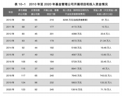 踐行社會責(zé)任是公募基金業(yè)發(fā)展的立身之本。作為中國資本市場上的重要參與者和投融資的重要樞紐,中國基金業(yè)經(jīng)過20多年的發(fā)展,不斷融入國家發(fā)展戰(zhàn)略,不斷暢通資本市場和實(shí)體經(jīng)濟(jì)的良性循環(huán)方面積極探索,在為投資者奉獻(xiàn)匯報(bào)的同時(shí)也肩負(fù)起更多的社會責(zé)任,在努力譜寫發(fā)展壯大新篇章的同時(shí)也展現(xiàn)出資本市場里溫情的一面。 日前,中國證券投資基金業(yè)協(xié)會通過收集123家公募基金公司的社會責(zé)任問卷反饋、108家精準(zhǔn)扶貧問卷反饋,發(fā)布了2021年度《公募基金行業(yè)社會責(zé)任履行情況報(bào)告》和《精準(zhǔn)扶貧報(bào)告》。 報(bào)告顯示,近年來公募基金服務(wù)國家脫貧攻堅(jiān)戰(zhàn)略,通過發(fā)揮專業(yè)能力、參與扶貧公益,有效解決了貧困地區(qū)投資主體單一、社會發(fā)展和民生公益等問題,激發(fā)了貧困地區(qū)發(fā)展的內(nèi)生動(dòng)力,推動(dòng)貧困地區(qū)經(jīng)濟(jì)均衡發(fā)展、民生公益保障提升。 多點(diǎn)開花踐行社會責(zé)任 行業(yè)越成熟,企業(yè)越壯大,肩負(fù)的社會責(zé)任也越大。隨著經(jīng)濟(jì)的快速發(fā)展,越來越多中國企業(yè)開始重視社會責(zé)任。這其中,基金公司的身影日漸活躍。 據(jù)了解,《公募基金行業(yè)社會責(zé)任履行情況報(bào)告》共175個(gè)案例,從多維度展示了公募基金行業(yè)推動(dòng)實(shí)體經(jīng)濟(jì)發(fā)展、服務(wù)國家戰(zhàn)略、抗擊疫情、積極投身公益慈善事業(yè)等共計(jì)12個(gè)方面的社會責(zé)任履行情況;《精準(zhǔn)扶貧報(bào)告》共150個(gè)案例,從金融扶貧、產(chǎn)業(yè)扶貧、教育扶志及扶智、醫(yī)療扶貧、生態(tài)扶貧等五個(gè)方向32個(gè)專項(xiàng)領(lǐng)域展現(xiàn)了公募基金精準(zhǔn)扶貧工作中的探索。 中國基金業(yè)協(xié)會指出,2020年以來,公募基金優(yōu)化行業(yè)生態(tài)、加快文化建設(shè),在合規(guī)、穩(wěn)健、專業(yè)、誠信等方面落實(shí)文化理念;馳援抗疫一線、維護(hù)市場穩(wěn)定,積極捐款捐物1.7億元;積極投身慈善,開展245個(gè)公益慈善項(xiàng)目、投入資金1.4億元,項(xiàng)目受益人數(shù)71.79萬人;堅(jiān)持責(zé)任投資,守護(hù)綠水青山,設(shè)立低碳環(huán)保、美麗中國、可持續(xù)發(fā)展、綠色、公司治理、養(yǎng)老等符合社會責(zé)任投資方向和理念的基金247只;投資者教育領(lǐng)域投入超2億元,累計(jì)舉辦投教活動(dòng)1.5萬余次、受眾超1.1億人次;行業(yè)1776只基金分紅約1.13萬次,分紅金額超2.6億元。 在履行環(huán)境責(zé)任中,基金行業(yè)積極探索以不同方式在低碳轉(zhuǎn)型中扮演重要角色,不斷拓寬綠色融資渠道、完善綠色投資管理體系、加強(qiáng)綠色金融研究與創(chuàng)新、加大碳金融服務(wù)創(chuàng)新等方面擔(dān)當(dāng)作為,積極推動(dòng)中國經(jīng)濟(jì)發(fā)展綠色可持續(xù)轉(zhuǎn)型。 持續(xù)貢獻(xiàn)公益“基金力量” 公益慈善是溫暖的力量,星星之火可以給一個(gè)家庭帶來希望,燎原之勢可以成為社會進(jìn)步的動(dòng)力。持續(xù)的公益精神可以給民眾以信心,把有限的物質(zhì)資源變成無限的精神財(cái)富。 基金行業(yè)作為經(jīng)濟(jì)金融高度發(fā)展的產(chǎn)物,與公益慈善在理念價(jià)值上有著天然的契合點(diǎn)?;鹦袠I(yè)在公益項(xiàng)目上具有廣闊的發(fā)展空間,而發(fā)展公益項(xiàng)目對基金行業(yè)來說也是責(zé)無旁貸的使命與社會責(zé)任。調(diào)查顯示,各基金管理公司持續(xù)保持資金投入,以公益慈善主題,開展特色實(shí)踐活動(dòng),投身公益事業(yè),為普及慈善意識、提升社會福利水平而作出積極貢獻(xiàn)。 各基金公司在為投資者不斷創(chuàng)造價(jià)值的同時(shí),積極踐行社會責(zé)任使命,關(guān)愛青少年教育,幫扶孤寡老人,踐行環(huán)保事業(yè),深入開展各項(xiàng)慈善公益活動(dòng)。公募基金行業(yè)還發(fā)揮自身專業(yè)優(yōu)勢,建立公益慈善基金會和專項(xiàng)基金,從自身專業(yè)角度出發(fā),促進(jìn)公益慈善事業(yè)的專業(yè)化運(yùn)作。以基金會為主要代表的公益慈善組織在救災(zāi)扶貧、治病救危、提供社會服務(wù)和促進(jìn)社會和諧等方面發(fā)揮著越來越重要的作用。 數(shù)據(jù)顯示,2020年,在接受調(diào)查的123家基金公司中,有92家公司共開展了245個(gè)公益慈善活動(dòng),同比增加5.6%。項(xiàng)目投入總資金達(dá)13915.5萬元以上(不含投資者教育投入),同比增長58.3%。這也是近十年來首次金額突破1億元。 投入資金數(shù)額超過100萬元的有34家,同比增長61.7%。投入資金數(shù)額超過300萬元的有17家,總投入金額為10063.1萬元,占全部投入總額的72.32%。 值得一提的是,在123家基金公司中,有16家公司設(shè)立了專門的基金會,有13家公司設(shè)立了15只專項(xiàng)基金,進(jìn)行公益慈善事業(yè)的管理和運(yùn)作。16家基金會自成立以來,累計(jì)捐贈已超過3.4億元;15只專項(xiàng)基金成立以來累計(jì)對外捐贈總額9945.93萬元。 老牌基金公司在往年的公益項(xiàng)目基礎(chǔ)上不斷提升,年輕的基金公司也在公益慈善方面不斷前行?;鹦袠I(yè)