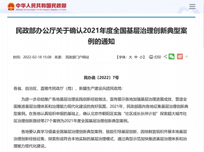 為進(jìn)一步總結(jié)推廣各地基層治理實(shí)踐創(chuàng)新經(jīng)驗(yàn)做法,宣傳展示各地加強(qiáng)基層治理進(jìn)展成效,營造全面推進(jìn)基層治理體系和治理能力現(xiàn)代化建設(shè)的良好氛圍,2021年,民政部面向各地征集基層治理創(chuàng)新典型案例。在各地認(rèn)真組織申報的基礎(chǔ)上,確認(rèn)北京市朝陽區(qū)實(shí)施“社區(qū)成長伙伴計(jì)劃”探索超大城市社區(qū)治理創(chuàng)新路徑等27個案例為2021年度全國基層治理創(chuàng)新典型案例。 各地要認(rèn)真學(xué)習(xí)借鑒全國基層治理創(chuàng)新典型案例,鼓勵引導(dǎo)基層創(chuàng)新,因地制宜組織開展本地基層治理創(chuàng)新經(jīng)驗(yàn)征集,探索形成符合本地實(shí)際的基層治理模式,通過典型示范加快推進(jìn)基層治理體系和治理能力現(xiàn)代化建設(shè)。 以下為2021年度全國基層治理創(chuàng)新典型案例名單: 1.北京市朝陽區(qū):實(shí)施“社區(qū)成長伙伴計(jì)劃”探索超大城市社區(qū)治理創(chuàng)新路徑 2.北京市昌平區(qū):實(shí)施公共服務(wù)設(shè)施提升三年行動計(jì)劃破解回天地區(qū)治理難題 3.吉林省琿春市:聚力攻堅(jiān)打造專業(yè)化職業(yè)化社區(qū)工作者隊(duì)伍 4.上海市浦東新區(qū):建設(shè)“家門口”服務(wù)體系“繡”出高品質(zhì)社區(qū)服務(wù) 5.江蘇省南京市鼓樓區(qū):以居民滿意度考評機(jī)制推動街道服務(wù)管理再創(chuàng)新 6.江蘇省無錫市新吳區(qū)旺莊街道:實(shí)施“益動旺莊”成長計(jì)劃探索社區(qū)工作者階梯式培養(yǎng)新模式 7.浙江省杭州市西湖區(qū):以民生綜合體打造社區(qū)服務(wù)體系建設(shè)新樣本 8.浙江省麗水市蓮都區(qū):陽光票決制助推農(nóng)村社區(qū)治理創(chuàng)新 9.浙江省寧波市江北區(qū):“一件事”集成改革激發(fā)基層治理新動能 10.福建省廈門市思明區(qū):打造“近鄰社區(qū)”促進(jìn)社區(qū)共建共治共享 11.山東省平邑縣:黨建統(tǒng)領(lǐng)“三治”結(jié)合構(gòu)建城鄉(xiāng)社區(qū)治理新體系 12.山東省東營市東營區(qū):六維雙向融合,油地共建共享,創(chuàng)新打造社區(qū)治理共同體 13.江西省南昌市西湖區(qū):“幸福圓桌會”提升社區(qū)治理精細(xì)化水平 14.河南省新鄉(xiāng)市紅旗區(qū):創(chuàng)新場景拓寬社區(qū)治理全新路徑 15.湖北省宜都市:村規(guī)民約為農(nóng)村社區(qū)治理添活力 16.湖南省湘潭市雨湖區(qū):強(qiáng)基礎(chǔ)促合力加強(qiáng)鄉(xiāng)鎮(zhèn)(街道)服務(wù)能力建設(shè) 17.廣東省佛山市禪城區(qū):“大數(shù)據(jù)·微服務(wù)”構(gòu)建社區(qū)治理服務(wù)新模式 18.廣東省東莞市:以“民生大莞家”推進(jìn)鄉(xiāng)鎮(zhèn)政府服務(wù)能力提檔升級 19.廣西壯族自治區(qū)柳州市柳南區(qū):規(guī)范基層協(xié)商促進(jìn)街道治理提質(zhì)增效 20.廣西壯族自治區(qū)來賓市興賓區(qū)橋鞏鎮(zhèn)毛塘村:“五清單、六步驟”創(chuàng)新村級議事協(xié)商實(shí)踐 21.重慶市江津區(qū):構(gòu)建簡約高效體制提升鄉(xiāng)鎮(zhèn)治理能力 22.重慶市九龍坡區(qū)石坪橋街道:專項(xiàng)基金推進(jìn)社區(qū)治理共治融合創(chuàng)新 23.四川省成都市金牛區(qū):黨建引領(lǐng)提案工作機(jī)制激發(fā)社區(qū)治理內(nèi)生動力 24.四川省漢源縣:央企協(xié)同趟出瀑電庫區(qū)基層治理新路子 25.貴州省凱里市:創(chuàng)新“村社宜站”加強(qiáng)村綜合服務(wù)能力建設(shè) 26.陜西省寶雞市陳倉區(qū):“三辦”并舉促進(jìn)鄉(xiāng)鎮(zhèn)政府服務(wù)見實(shí)效 27.寧夏回族自治區(qū)中寧縣:疏堵結(jié)合著力破解社區(qū)“萬能章”頑瘴痼疾 (據(jù)民政部官網(wǎng)) |