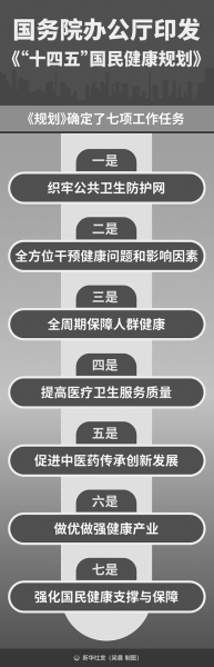國務院辦公廳日前印發(fā)《‘十四五’國民健康規(guī)劃》(以下簡稱《規(guī)劃》)。《規(guī)劃》提出,到2025年,公共衛(wèi)生服務能力顯著增強,一批重大疾病危害得到控制和消除,醫(yī)療衛(wèi)生服務質量持續(xù)改善,醫(yī)療衛(wèi)生相關支撐能力和健康產業(yè)發(fā)展水平不斷提升,國民健康政策體系進一步健全,人均預期壽命在2020年基礎上繼續(xù)提高1歲左右。 《規(guī)劃》指出,“十四五”時期衛(wèi)生健康工作堅持以習近平新時代中國特色社會主義思想為指導,把人民群眾生命安全和身體健康放在第一位,全面推進健康中國建設,加快實施健康中國行動,深化醫(yī)藥衛(wèi)生體制改革,持續(xù)推動發(fā)展方式從以治病為中心轉變?yōu)橐匀嗣窠】禐橹行?,為群眾提供全方位全周期健康服務?/p> 《規(guī)劃》確定了七項工作任務。一是織牢公共衛(wèi)生防護網。提高疾病預防控制能力,完善監(jiān)測預警機制,健全應急響應和處置機制,提高重大疫情救治能力。二是全方位干預健康問題和影響因素。普及健康生活方式,加強傳染病、寄生蟲病和地方病防控,強化慢性病綜合防控和傷害預防干預,完善心理健康和精神衛(wèi)生服務,維護環(huán)境健康與食品藥品安全,深入開展愛國衛(wèi)生運動。三是全周期保障人群健康。完善生育和嬰幼兒照護服務,保護婦女和兒童健康,促進老年人健康,加強職業(yè)健康保護,保障脫貧地區(qū)和殘疾人等相關重點人群健康服務。四是提高醫(yī)療衛(wèi)生服務質量。優(yōu)化醫(yī)療服務模式,加強醫(yī)療質量管理,加快補齊服務短板。五是促進中醫(yī)藥傳承創(chuàng)新發(fā)展。充分發(fā)揮中醫(yī)藥在健康服務中的作用,夯實中醫(yī)藥高質量發(fā)展基礎。六是做優(yōu)做強健康產業(yè)。推動醫(yī)藥工業(yè)創(chuàng)新發(fā)展,促進高端醫(yī)療裝備和健康用品制造生產,促進社會辦醫(yī)持續(xù)規(guī)范發(fā)展,增加商業(yè)健康保險供給,推進健康相關業(yè)態(tài)融合發(fā)展。七是強化國民健康支撐與保障。深化醫(yī)藥衛(wèi)生體制改革,強化衛(wèi)生健康人才隊伍建設,加快衛(wèi)生健康科技創(chuàng)新,促進全民健康信息聯(lián)通應用,完善衛(wèi)生健康法治體系,加強交流合作。 《規(guī)劃》提出,加強組織領導,動員各方參與,做好宣傳引導,強化監(jiān)測評價,推動各項任務落實。 (據新華社) |