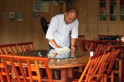 7月2日,在湖南省湘西土家族苗族自治州十八洞村,楊正邦在自家農(nóng)家樂打掃衛(wèi)生(新華社記者 薛宇舸/攝)