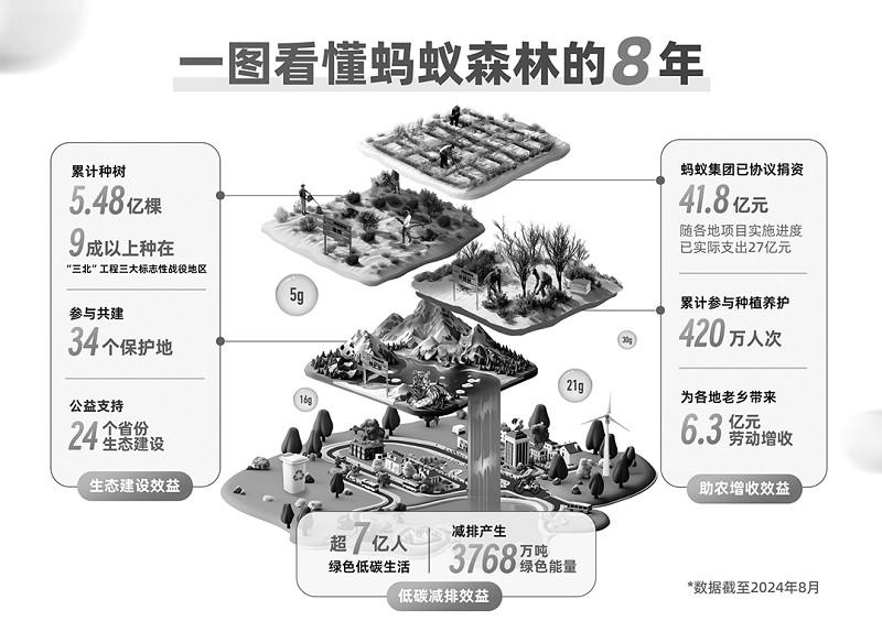 近日,螞蟻集團公布了生態(tài)公益項目“螞蟻森林”的最新進展。數(shù)據(jù)顯示,螞蟻森林自2016年8月上線支付寶,8年來已在全國各地捐資種下5.48億棵樹,其中9成以上種在“三北”工程三大標志性戰(zhàn)役地區(qū)。截至目前,螞蟻集團為該項目累計協(xié)議捐資41.8億元(隨著各地生態(tài)項目的實施進度,已實際支出27億元),其中有6.3億元成為各地種植養(yǎng)護者的勞動收入。 其中,在生態(tài)修復方面——螞蟻森林在內(nèi)蒙古、甘肅、河北、陜西、青海、寧夏、新疆等13個省份已種下超5.48億棵樹,種植總面積580萬畝。其中,9成以上的樹種在了“三北”工程三大標志性戰(zhàn)役地區(qū),助力當?shù)氐幕哪卫砗头郎持紊彻ぷ鳌?br> 在生物多樣性保護方面——螞蟻森林在青海、云南、四川、西藏、吉林、黑龍江、廣東等16個省份參與共建34個公益保護地,面積超過4900平方公里,在我國落實“昆明—蒙特利爾全球生物多樣性框架”的目標下,積極參與生物多樣性保護,發(fā)揮來自企業(yè)界的力量。 從“以荒漠化治理為主的生態(tài)修復”到“以保護地建設為主的生物多樣性保護”,再到近年來新增的海洋生態(tài)保護、凈灘減塑項目,目前螞蟻森林的各類項目已累計參與支持了全國24個省份的生態(tài)建設。 據(jù)統(tǒng)計,螞蟻森林各類項目的實施已為各地累計創(chuàng)造了420多萬人次的種植、養(yǎng)護、巡護等勞動增收機會。在梭梭根部接種蓯蓉、采摘花棒沙棘的種子和果實、灌木平茬用作飼料發(fā)展養(yǎng)殖業(yè)……螞蟻森林的種植項目在各地實施8年來,當?shù)氐娜罕娨虻刂埔?、護綠養(yǎng)綠,開辟了不少新的致富途徑。參與螞蟻森林種植養(yǎng)護的老鄉(xiāng)們不僅獲得了勞務性收入,還切實感受到了更多生態(tài)改善帶來的“實惠”。 “只有種上樹,讓沙丘無路可走,人才有奔頭?!笨耸部蓑v旗烏蘭布統(tǒng)的劉保軍參與種樹治沙15年,不僅親歷了當?shù)厣鷳B(tài)修復的過程,還見證了草原得到治理后旅游業(yè)迸發(fā)出的新活力?!皹浞N上后環(huán)境變美了,鴻雁、赤麻鴨這些遷徙的鳥類,選擇在這里生兒育女,游客也多了,騎馬住民宿,成為我們這里的一個經(jīng)濟來源?!?br> “獨木難成林,加上生態(tài)見效的長期性,注定了螞蟻森林是一場需要社會各方參與支持的公益長跑。8年時間里,有30多家公益機構(gòu)和專業(yè)機構(gòu),負責螞蟻森林各類項目的實施?!蔽浵伡瘓F資深副總裁、首席可持續(xù)發(fā)展官彭翼捷表示,螞蟻森林8年來初見成效,見證了“守護綠水青山、踐行綠色低碳”已成為全社會的共識,與捐資金額以及種下了多少棵樹相比,更可貴的是累計已有超過7億人通過螞蟻森林踐行低碳生活。 螞蟻森林基金會秘書長王小穎表示,螞蟻森林用8年時間和“看得見的”生態(tài)保護修復效果,以互聯(lián)網(wǎng)的鏈接作用,有效帶動了社會公眾于生活點滴中認識低碳、踐行減排。據(jù)統(tǒng)計,8年來螞蟻森林的數(shù)億用戶通過綠色出行、減紙減塑、線上辦事、循環(huán)利用、節(jié)能降耗等低碳減排場景,已累計產(chǎn)生“綠色能量”3768萬噸。 “透過3700多萬噸這個數(shù)字,我們看見了在國家雙碳目標的引導下,越來越多的人已經(jīng)把綠色低碳作為自己的生活方式,不僅在日常點滴中積極踐行,還匯聚成了不可忽視的力量?!蓖跣》f透露,螞蟻森林近期將發(fā)布“新動作”,繼續(xù)以“綠色能量”為激勵手段,在全新的領域繼續(xù)推動公眾參與綠色低碳。 (皮磊) |