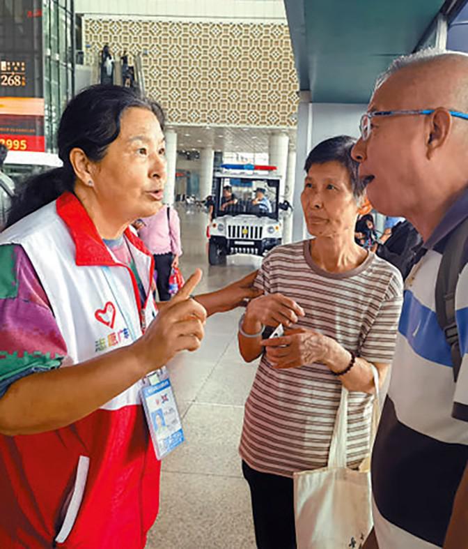 廣州南站的每個(gè)角落唐偉都了然于心。她已經(jīng)在這里服務(wù)超過(guò)13個(gè)年頭,是志愿服務(wù)隊(duì)里年紀(jì)最大的一名“銀發(fā)”志愿者,人們親切地稱呼她為“唐姨”?!白鲋驹阜?wù)真的會(huì)停不下來(lái),幫助到別人,我心里感到真正的快樂(lè)。”唐偉第一次與志愿服務(wù)結(jié)緣是參與小區(qū)街道組織的志愿活動(dòng),了解到廣州南站有個(gè)志愿服務(wù)隊(duì),已經(jīng)退休的唐偉就報(bào)名加入了?!拔矣浀玫谝惶煸趶V州南站當(dāng)志愿者時(shí),心情非常忐忑。但當(dāng)天我就幫到了很多人,幫老人推輪椅,幫盲人找到方向,幫旅客搬運(yùn)大件行李,心里特別滿足和高興!”唐偉說(shuō)。
