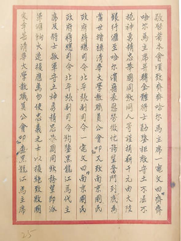 一封封書信、電報(bào),記錄下這段波瀾壯闊的歷史。1932年1月4日的《國(guó)立清華大學(xué)??飞希禽d馬占山將軍給清華大學(xué)的復(fù)電,稱:“承惠巨款,益勵(lì)初衷。謹(jǐn)率部曲遙致謝忱。”而收到平津?qū)W術(shù)團(tuán)體對(duì)日聯(lián)合會(huì)發(fā)來(lái)的電報(bào)后,馬占山更回復(fù),“占山忝屬軍人,尤其責(zé)無(wú)旁貸,茍一息之尚存,豈慮孤軍之苦戰(zhàn)。”鏗鏘有力的表達(dá),書就這位民族英雄的氣節(jié)風(fēng)骨,也掀開軍民同仇敵愾,保家衛(wèi)國(guó)的篇章。
