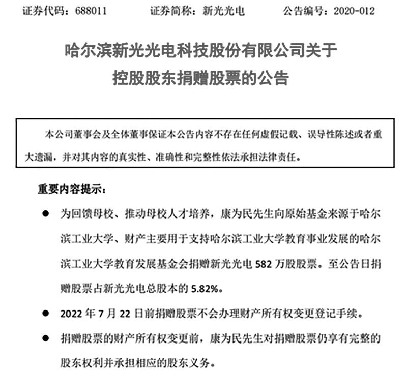 2020年6月2日,新光光電發(fā)布關于控股股東捐贈股票的公告。公告稱,公司于2020年6月1日接到控股股東康為民通知,其與哈爾濱工業(yè)大學教育發(fā)展基金會簽署了《捐贈協(xié)議書》。根據(jù)公告,為回饋母校、推動母校人才培養(yǎng),康為民向哈爾濱工業(yè)大學教育發(fā)展基金會捐贈新光光電582萬股股票。至公告日,捐贈股票占新光光電總股本的5.82%。按照當時股價計算,這批股票價值高達2.4億元。